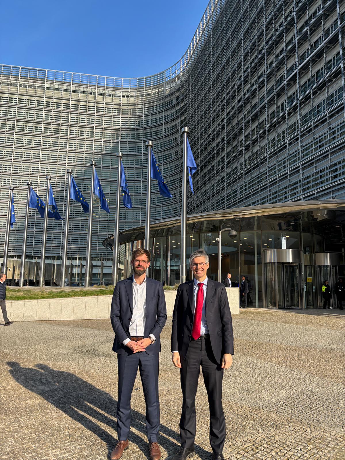 Brüssel. Gregor Beiner, der Präsident des Bundesverband Taxi und Mietwagen, hat letzte Woche in Brüssel zusammen mit Armand Joseph-Oudin (Paris, G7) Gespräche mit Vertreterinnen und Vertretern der Europäischen Kommission sowie mit Mitgliedern des Europäischen Parlaments geführt. Im Mittelpunkt standen die Rolle des Taxigewerbes bei der Dekarbonisierung des Straßenverkehrs sowie die Taxi-Perspektiven bei automatisierter Mobilität. In einem Austausch mit Sanna Laaksonen, Kabinettsmitglied der Exekutiv-Vizepräsidentin der Europäischen Kommission Henna Virkkunen (Technische Souveränität, Sicherheit und Demokratie), ging es insbesondere um die Entwicklungen im Bereich autonomer Fahrzeuge und deren Bedeutung für das Taxigewerbe.