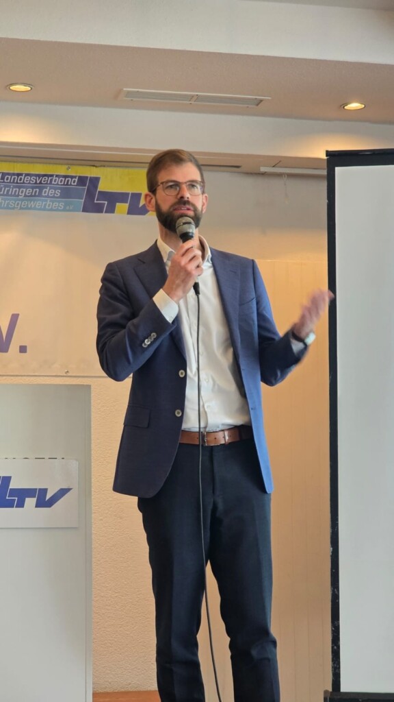 Inhaltlich ging Beiner auf zentrale Themen des Bundesverband Taxi und Mietwagen ein. Dazu zählen insbesondere die Stärkung und Weiterentwicklung von Krankenfahrten, die Förderung der E-Mobilität, die Vorbereitung auf autonomes Fahren sowie aktuelle Herausforderungen rund um das Personenbeförderungsgesetz (PBefG). Kritisch äußerte er sich zur Umsetzung des Mindestbeförderungsentgelts (MBE) und sprach von zunehmenden Belastungen für die Branche durch den Markteintritt von Uber und Bolt (nun auch in Erfurt) sowie auf Berichte des Zolls aus Köln und München. Beiner verwies ebenfalls auf positive Entwicklungen in Städten, die bereits MBE eingeführt hätten, wie Essen oder Heidelberg oder diese in naher Zukunft umsetzen werden, wie Köln und München. Er appellierte an die Politik, insbesondere an Staatssekretär Hirte, die Kommunen in der konsequenten Durchsetzung bestehender Regelungen zu stärken.