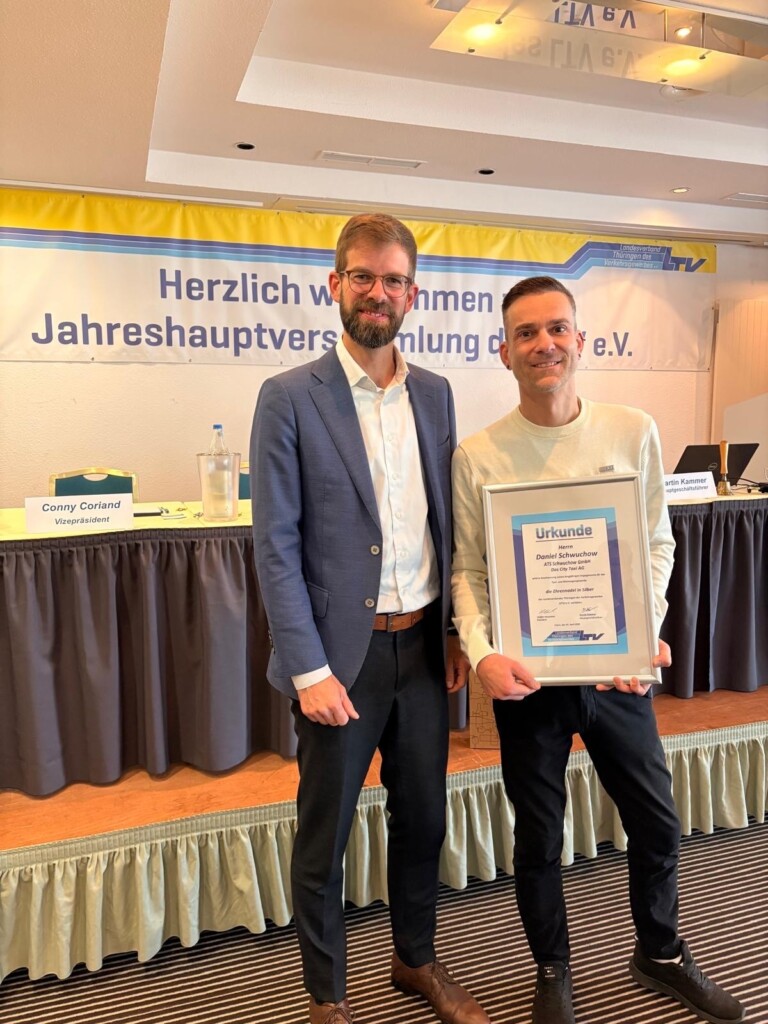 Ein besonderer Moment der Veranstaltung war die Auszeichnung von Daniel Schwuchow, Taxiunternehmer aus Erfurt, Vorstandsvorsitzender der Fachvereinigung Personenverkehr im LTV und Mitglied im Vorstand des Bundesverband Taxi und Mietwagen, der für sein Engagement für das Thüringer Verkehrsgewerbe mit der Ehrennadel in Silber ausgezeichnet wurde.